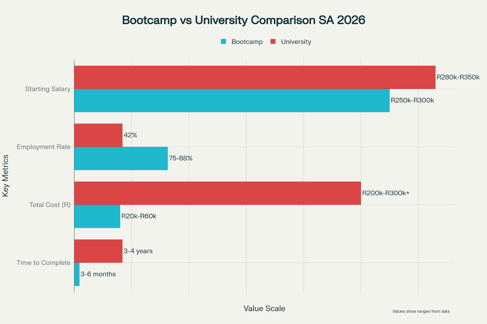 South Africa's technology sector has grown considerably with over 130 000 new job opportunities created and a strong demand for skilled professionals across various sectors. Coding bootcamps and university degrees are two viable and equally valid avenues for aspiring developers to enter this lucrative domain without much hassle. But which ones to choose? According to new data, the outcomes of different courses vary greatly. Coding bootcamps have 75-88% of their students getting jobs 6 months after graduation while this number is only 42% for University Computer Science graduates. This analysis looks at the realities, costs, and career outcomes of both educational pathways so you can decide which is best to kickstart your 2026 tech career. South Africa’s Current Tech Landscape.